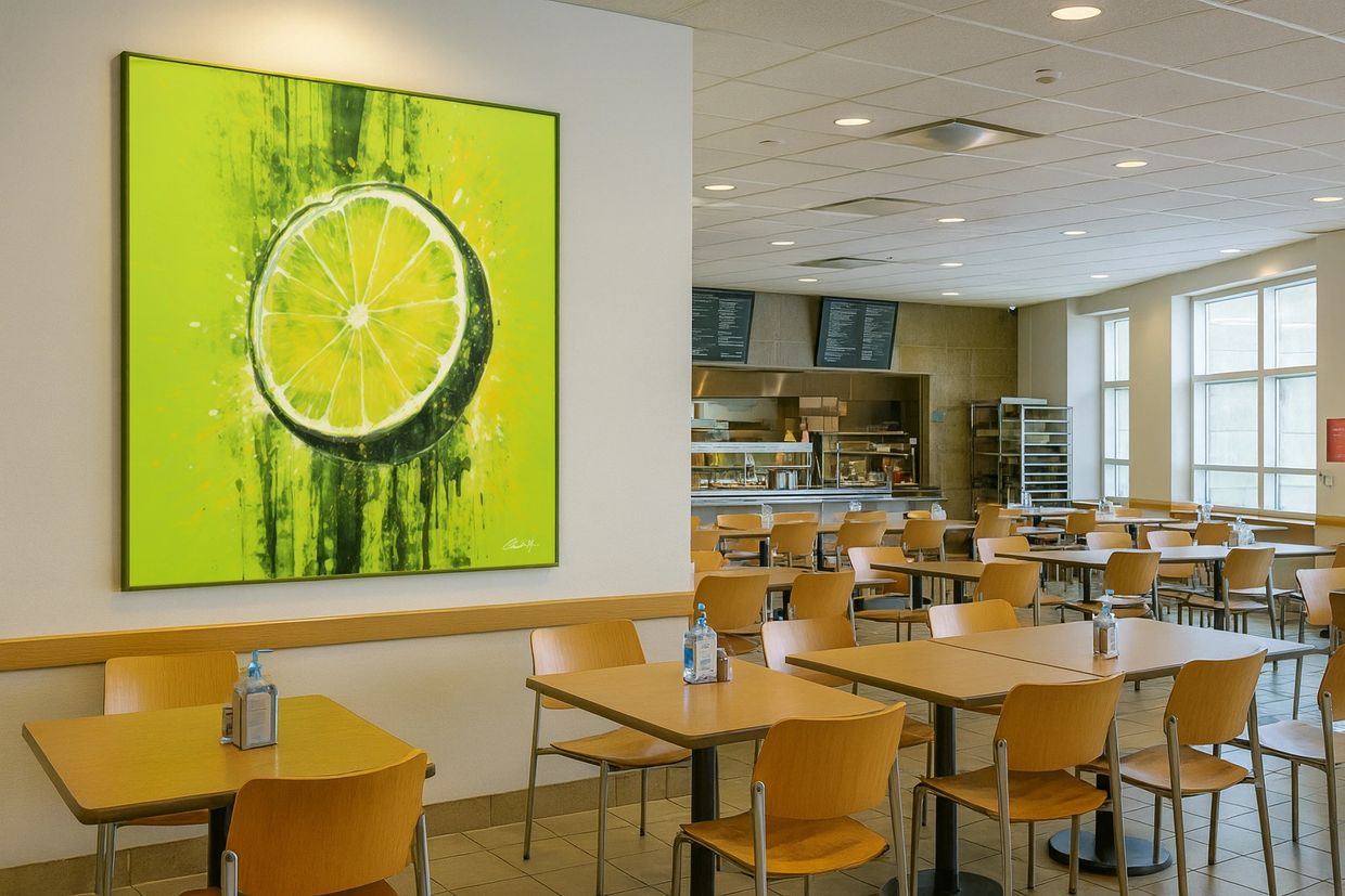 Bright color and playful energy uplift this shared cafeteria space, where bold lime artwork invites guests to gather, recharge, and connect.