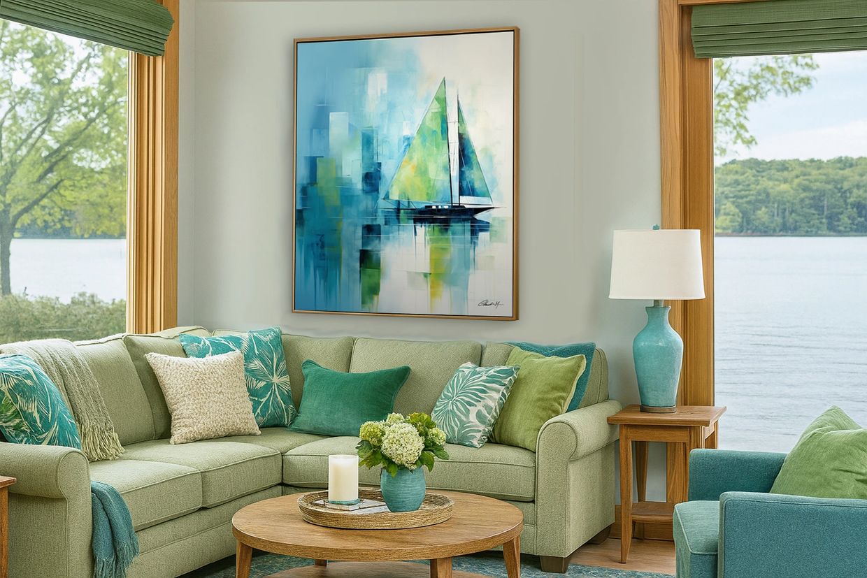Cool hues and calming waterside charm define this relaxed concept living space, where a vibrant sailboat sets the tone for lakeside leisure and reflection.