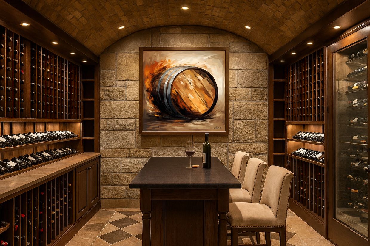 Rich textures and timeless craftsmanship meet modern artistry in this bespoke concept home wine cellar, where bold tones and a grounded centerpiece evoke warmth, tradition, and refined taste.