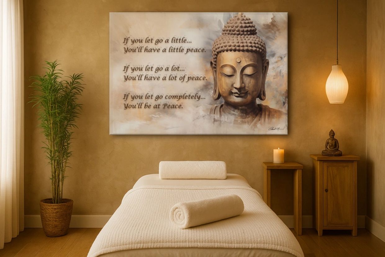 A concept massage room infused with warmth and simplicity, where soft lighting, peaceful textures, and a centered message encourage release. The serene Buddha reminds us that healing begins when we let go — creating a space for clients to unwind and reconnect.