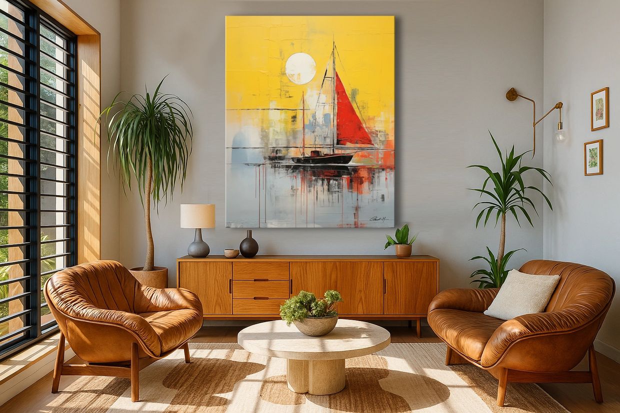Retro lines and golden light blend effortlessly in this modern concept room, where the vibrant artwork adds energy, movement, and a warm burst of personality.