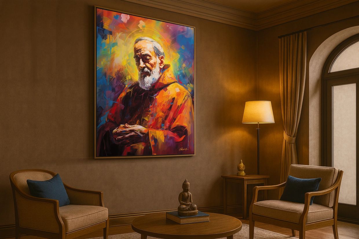 Warm illumination and quiet elegance enhance this deeply spiritual concept meeting space, anchored by artwork that radiates compassion, healing, and contemplative serenity.