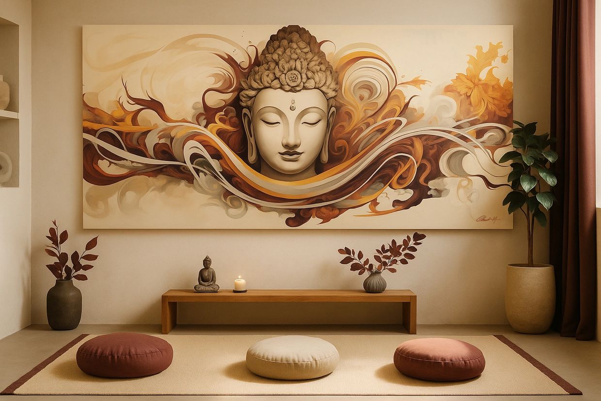 Minimalist elegance and gentle warmth create a soothing concept meditation environment, anchored by contemplative spiritual art.